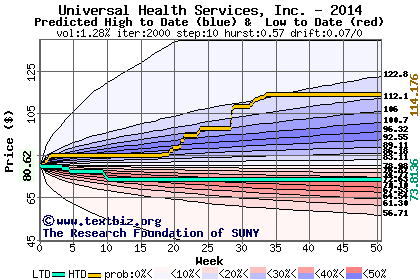 The high to date and low to date prices of the stock plotted against a random walk model for 2014 (what's this?).