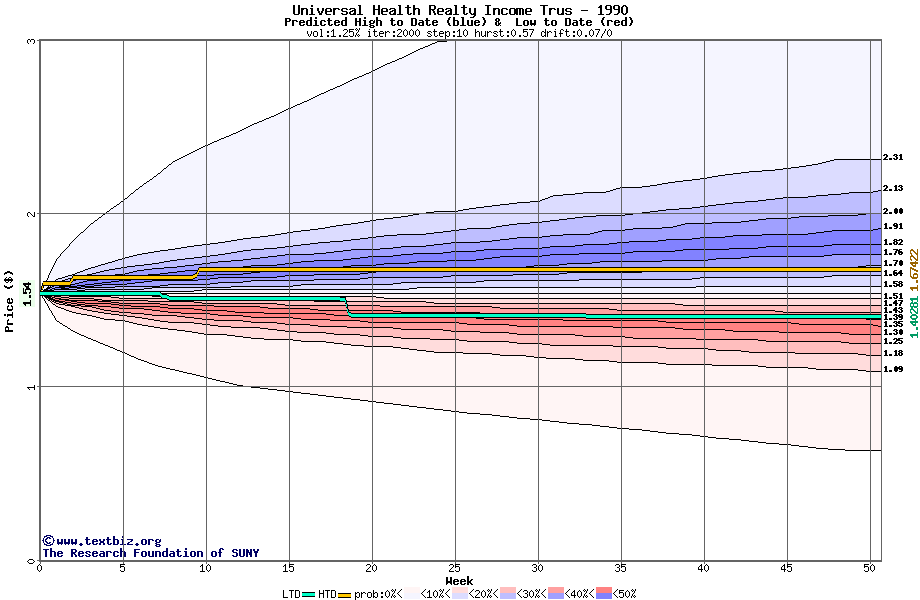 The high to date and low to date prices of the stock plotted against a random walk model for 1990 (what's this?).