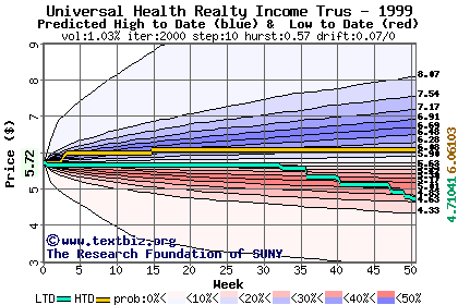 The high to date and low to date prices of the stock plotted against a random walk model for 1999 (what's this?).