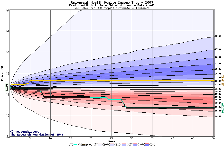 The high to date and low to date prices of the stock plotted against a random walk model for 2007 (what's this?).