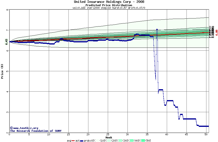 The following graph plots the year-to-date performance of the stock for 2008 compared to the probability calculated by a random walk model.