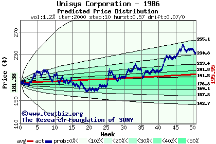 The following graph plots the year-to-date performance of the stock for 1986 compared to the probability calculated by a random walk model.