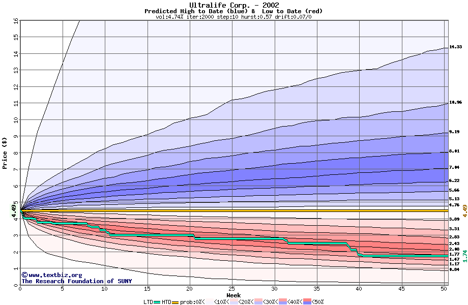 The high to date and low to date prices of the stock plotted against a random walk model for 2002 (what's this?).