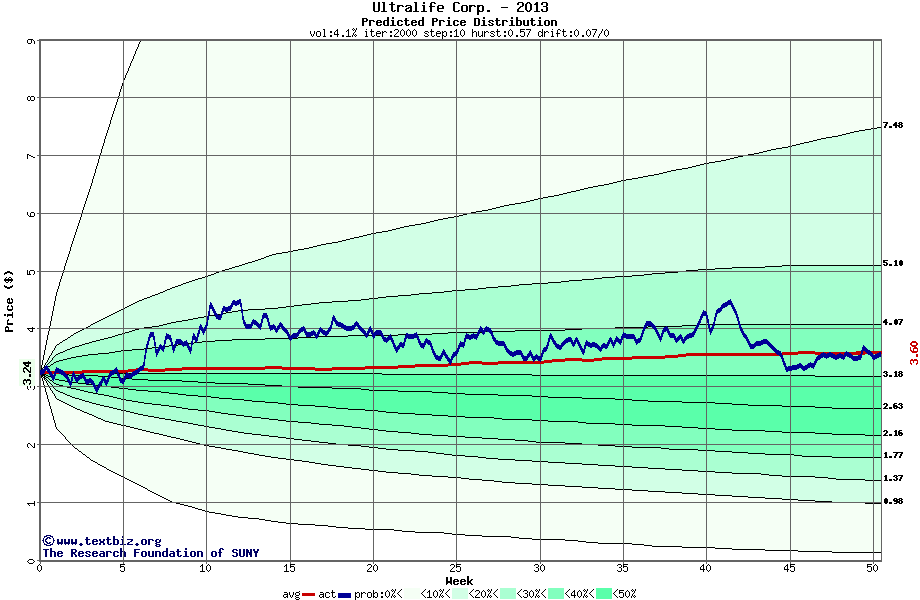 The following graph plots the year-to-date performance of the stock for 2013 compared to the probability calculated by a random walk model.