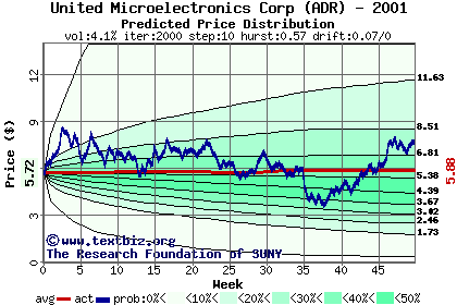 The high to date and low to date prices of the stock plotted against a random walk model for 2001 (what's this?).