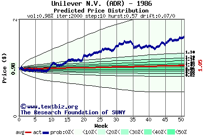 The high to date and low to date prices of the stock plotted against a random walk model for 1986 (what's this?).