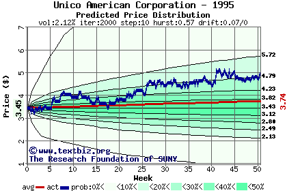 The high to date and low to date prices of the stock plotted against a random walk model for 1995 (what's this?).