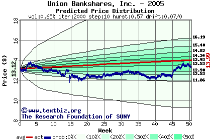 The following graph plots the year-to-date performance of the stock for 2005 compared to the probability calculated by a random walk model.