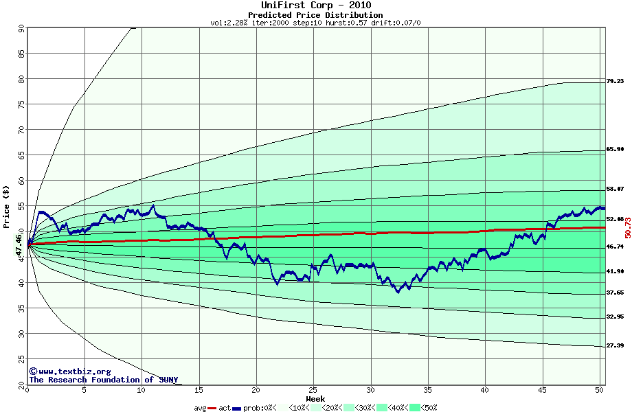 The following graph plots the year-to-date performance of the stock for 2010 compared to the probability calculated by a random walk model.