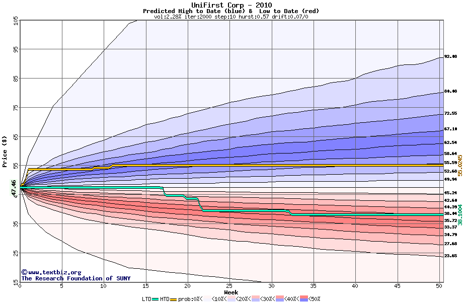 The high to date and low to date prices of the stock plotted against a random walk model for 2010 (what's this?).