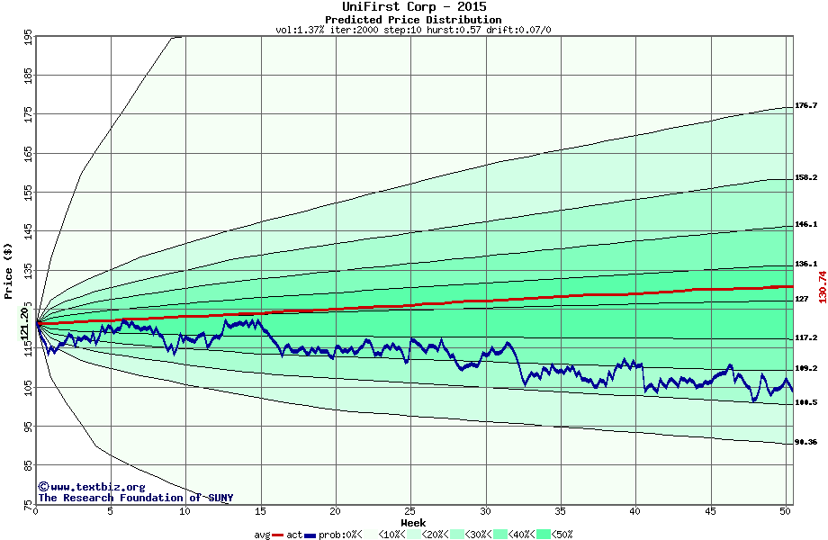 The following graph plots the year-to-date performance of the stock for 2015 compared to the probability calculated by a random walk model.