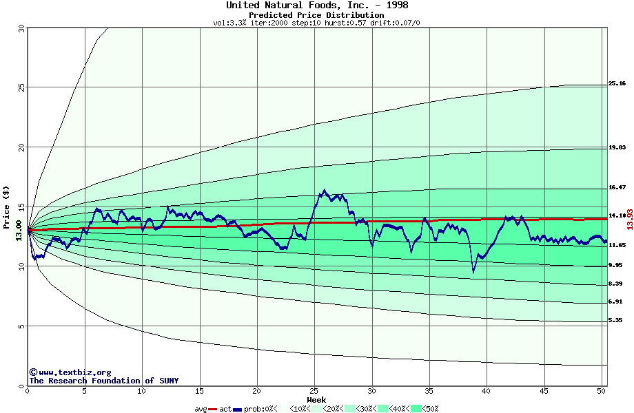 The following graph plots the year-to-date performance of the stock for 1998 compared to the probability calculated by a random walk model.