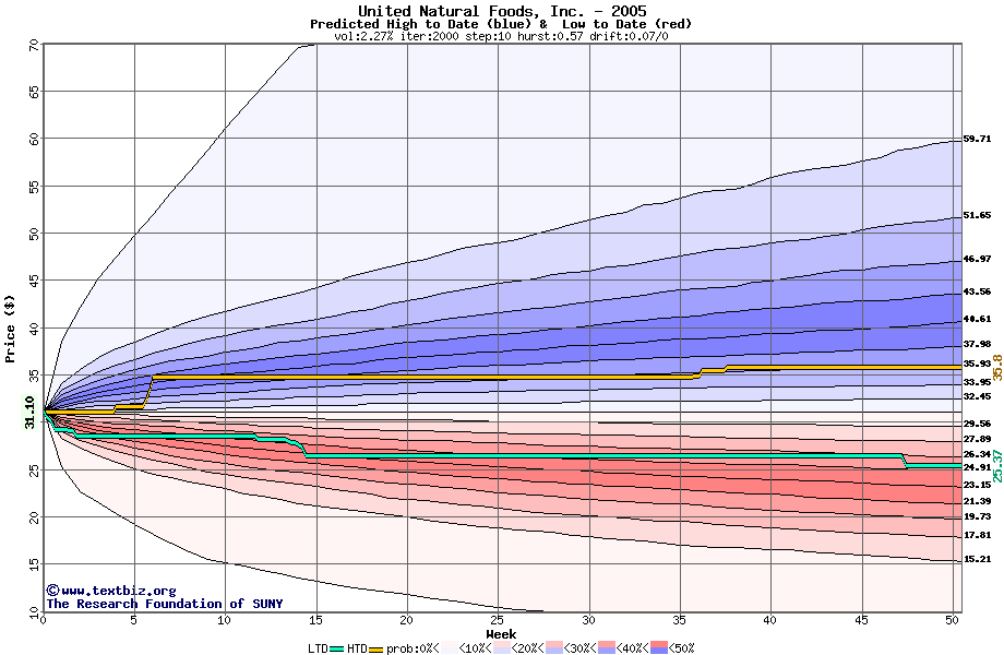 The following graph plots the year-to-date performance of the stock for 2005 compared to the probability calculated by a random walk model.