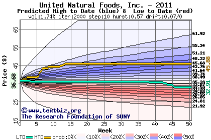 The high to date and low to date prices of the stock plotted against a random walk model for 2011 (what's this?).