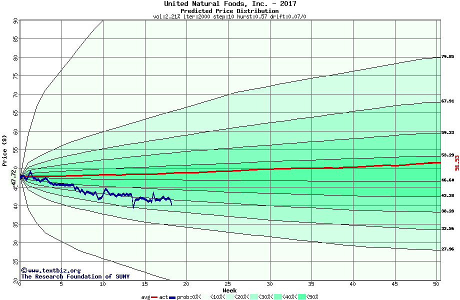 The following graph plots the year-to-date performance of the stock for 2017 compared to the probability calculated by a random walk model.