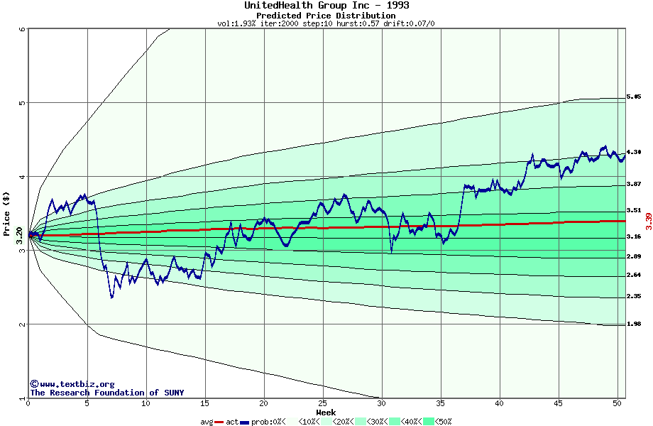 The following graph plots the year-to-date performance of the stock for 1993 compared to the probability calculated by a random walk model.
