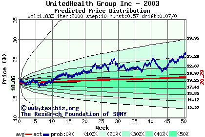 The high to date and low to date prices of the stock plotted against a random walk model for 2003 (what's this?).