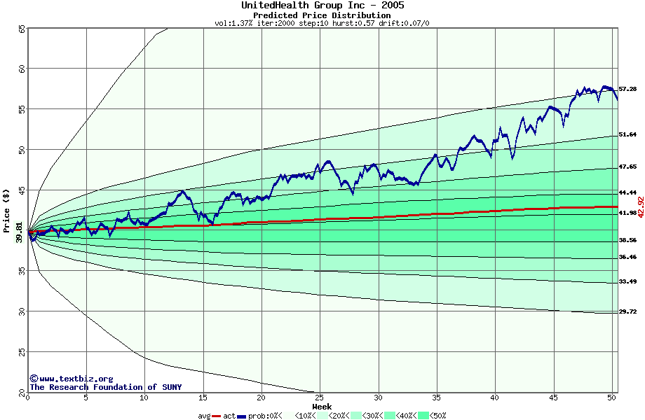 The following graph plots the year-to-date performance of the stock for 2005 compared to the probability calculated by a random walk model.