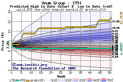 The high to date and low to date prices of the stock plotted against a random walk model for 1991 (what's this?).