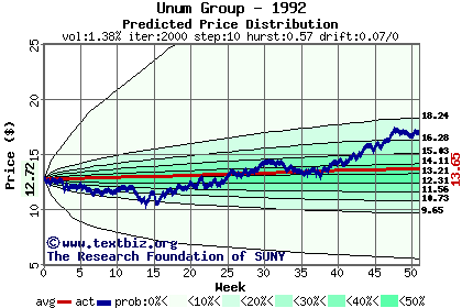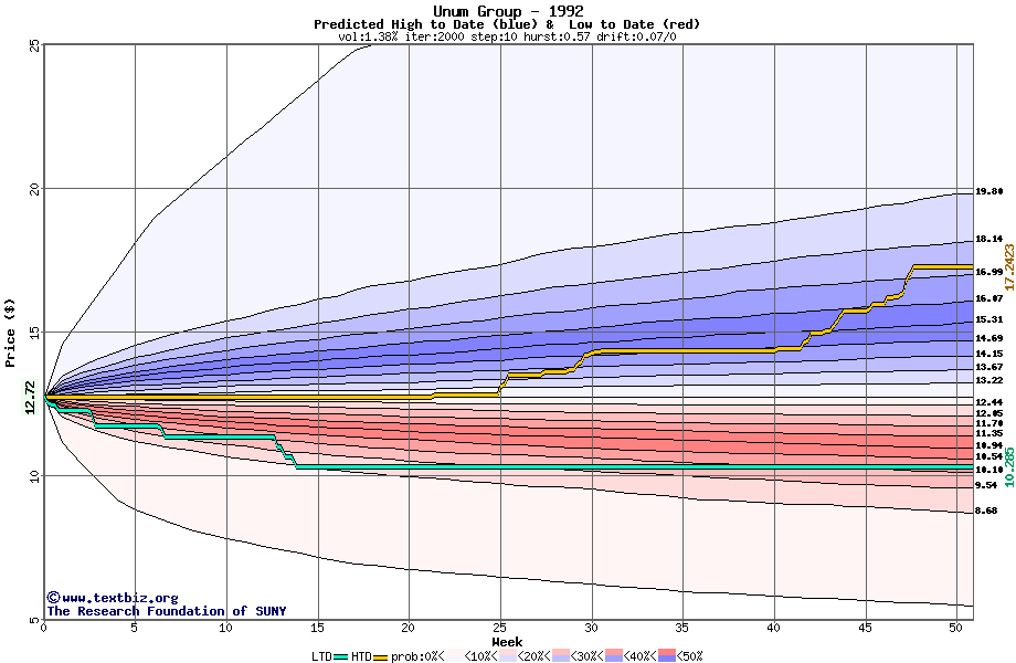 The high to date and low to date prices of the stock plotted against a random walk model for 1992 (what's this?).