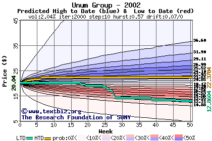 The high to date and low to date prices of the stock plotted against a random walk model for 2002 (what's this?).