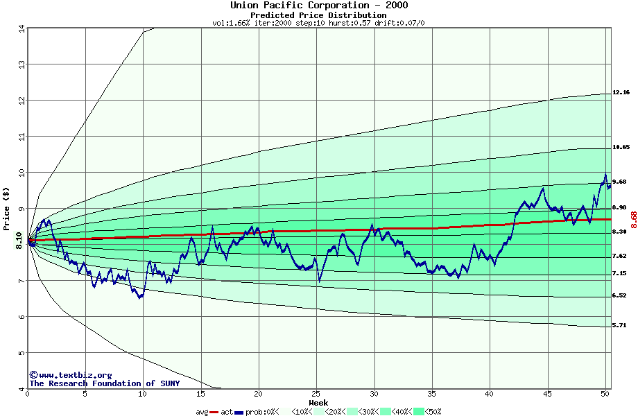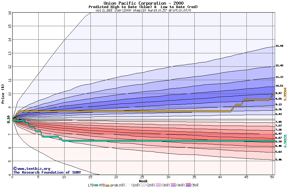 The high to date and low to date prices of the stock plotted against a random walk model for 2000 (what's this?).