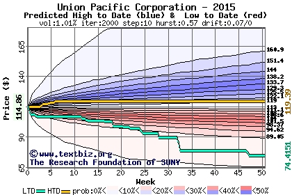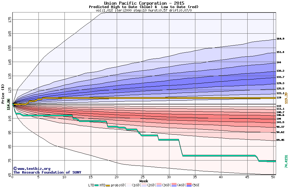 The following graph plots the year-to-date performance of the stock for 2015 compared to the probability calculated by a random walk model.