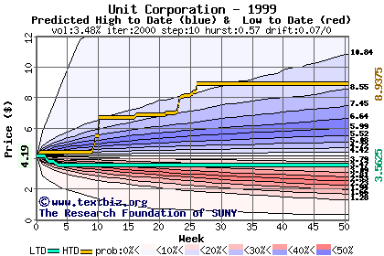 The high to date and low to date prices of the stock plotted against a random walk model for 1999 (what's this?).