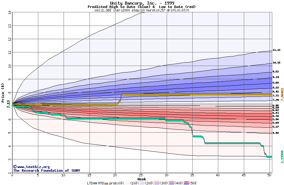 The high to date and low to date prices of the stock plotted against a random walk model for 1999 (what's this?).