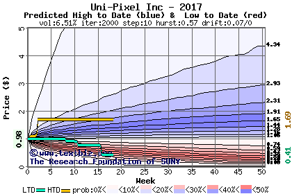 The high to date and low to date prices of the stock plotted against a random walk model for 2017 (what's this?).