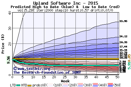The high to date and low to date prices of the stock plotted against a random walk model for 2015 (what's this?).