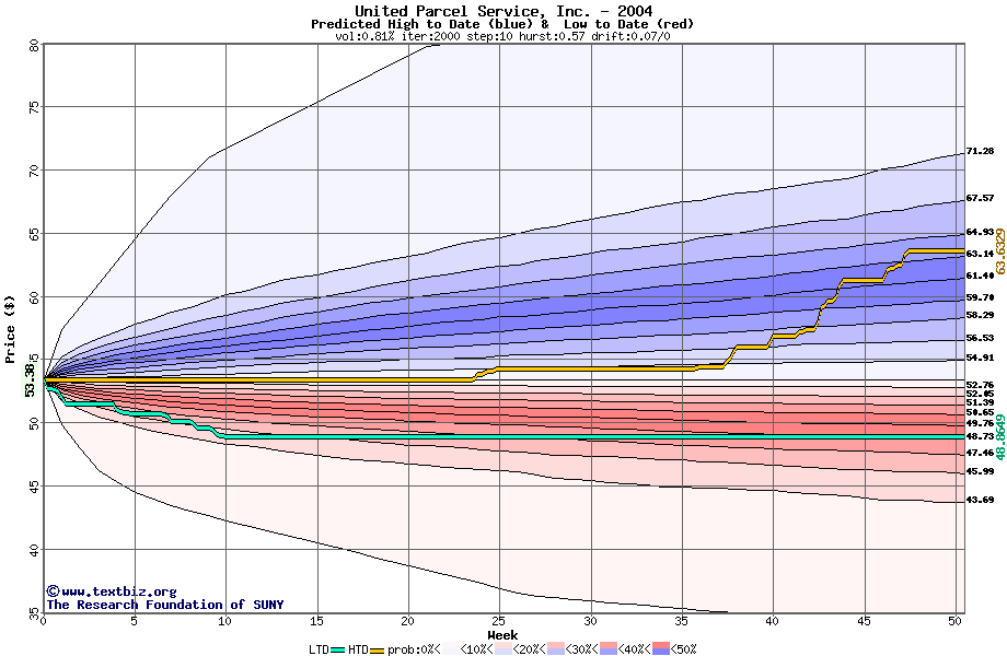 The high to date and low to date prices of the stock plotted against a random walk model for 2004 (what's this?).