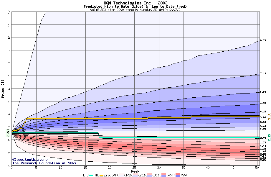 The high to date and low to date prices of the stock plotted against a random walk model for 2003 (what's this?).
