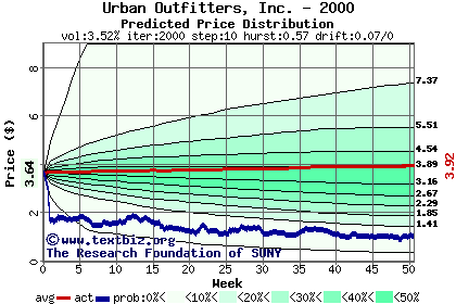 The high to date and low to date prices of the stock plotted against a random walk model for 2000 (what's this?).