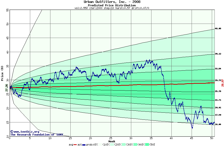 The following graph plots the year-to-date performance of the stock for 2008 compared to the probability calculated by a random walk model.