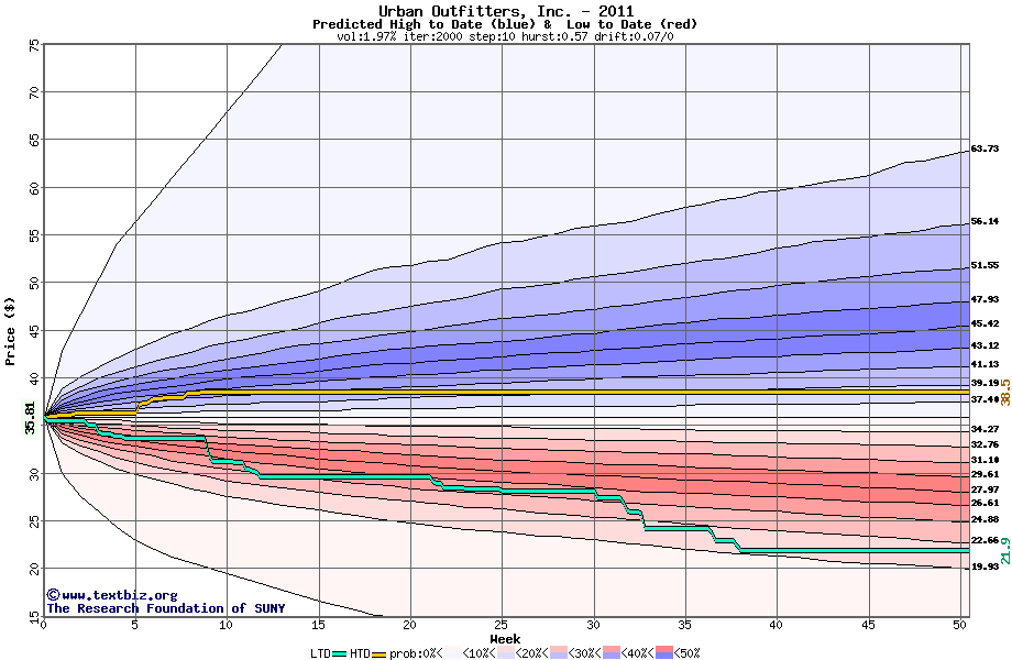 The high to date and low to date prices of the stock plotted against a random walk model for 2011 (what's this?).