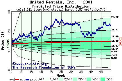 The high to date and low to date prices of the stock plotted against a random walk model for 2001 (what's this?).