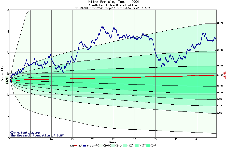 The following graph plots the year-to-date performance of the stock for 2001 compared to the probability calculated by a random walk model.
