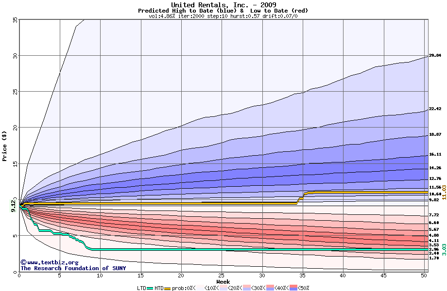The high to date and low to date prices of the stock plotted against a random walk model for 2009 (what's this?).