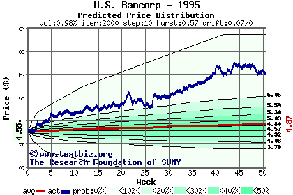 The high to date and low to date prices of the stock plotted against a random walk model for 1995 (what's this?).