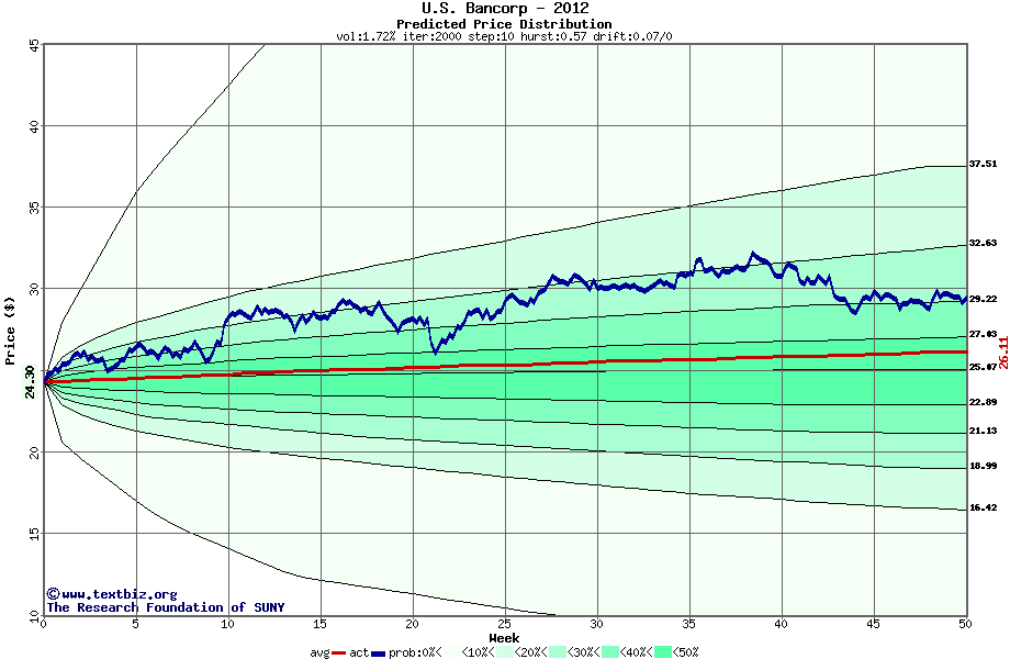 The following graph plots the year-to-date performance of the stock for 2012 compared to the probability calculated by a random walk model.