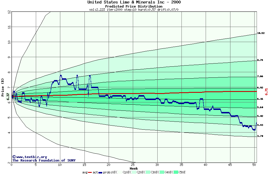 The following graph plots the year-to-date performance of the stock for 2000 compared to the probability calculated by a random walk model.