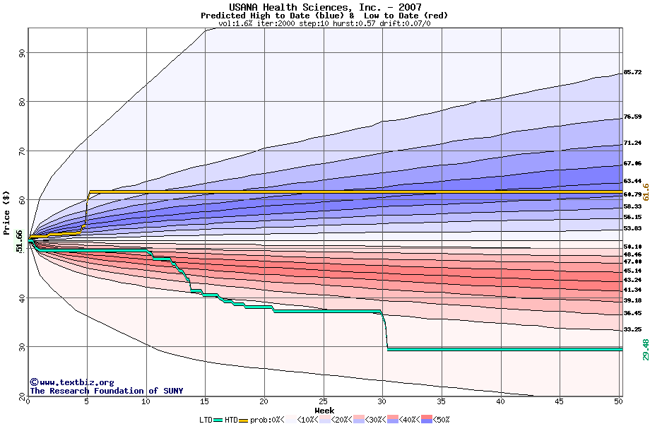 The high to date and low to date prices of the stock plotted against a random walk model for 2007 (what's this?).