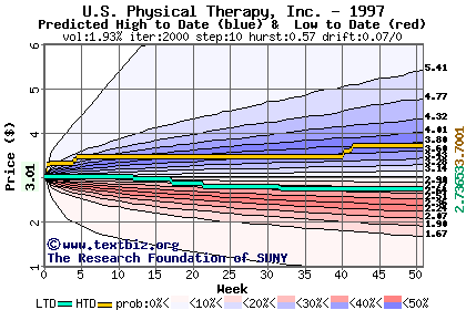 The high to date and low to date prices of the stock plotted against a random walk model for 1997 (what's this?).