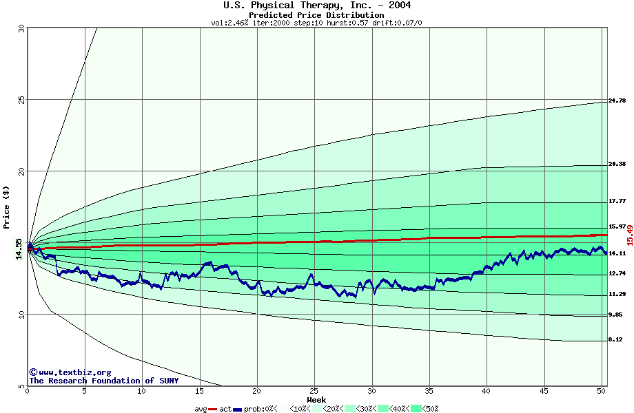 The following graph plots the year-to-date performance of the stock for 2004 compared to the probability calculated by a random walk model.