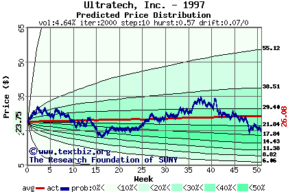 The following graph plots the year-to-date performance of the stock for 1997 compared to the probability calculated by a random walk model.