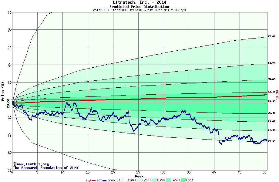The following graph plots the year-to-date performance of the stock for 2014 compared to the probability calculated by a random walk model.