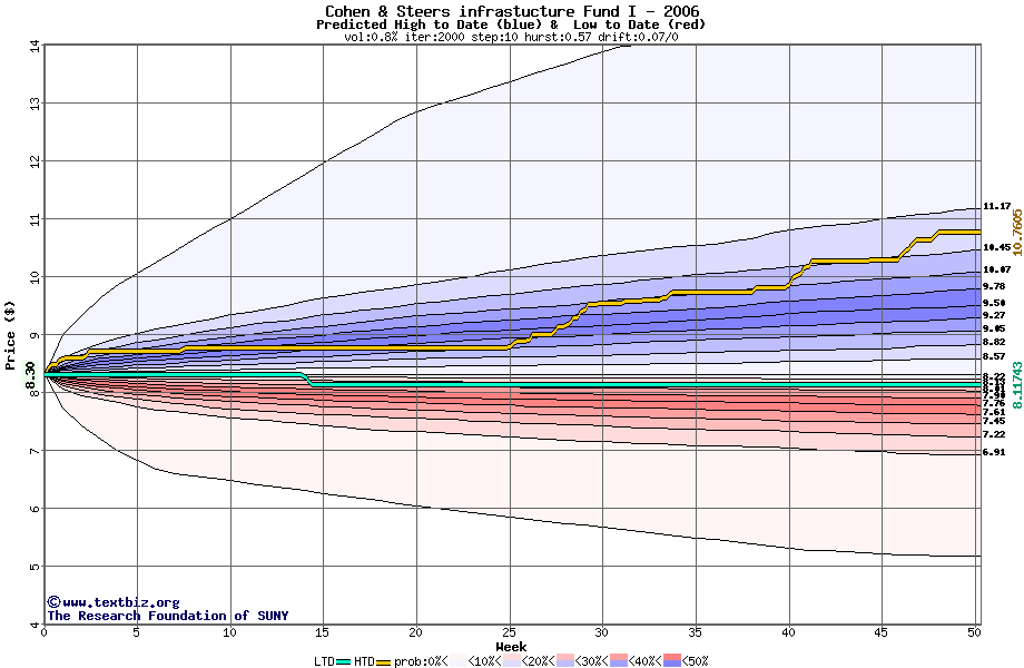 The high to date and low to date prices of the stock plotted against a random walk model for 2006 (what's this?).