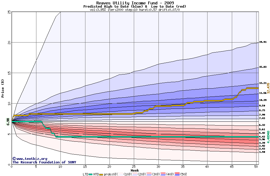 The high to date and low to date prices of the stock plotted against a random walk model for 2009 (what's this?).