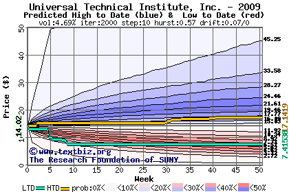 The high to date and low to date prices of the stock plotted against a random walk model for 2009 (what's this?).